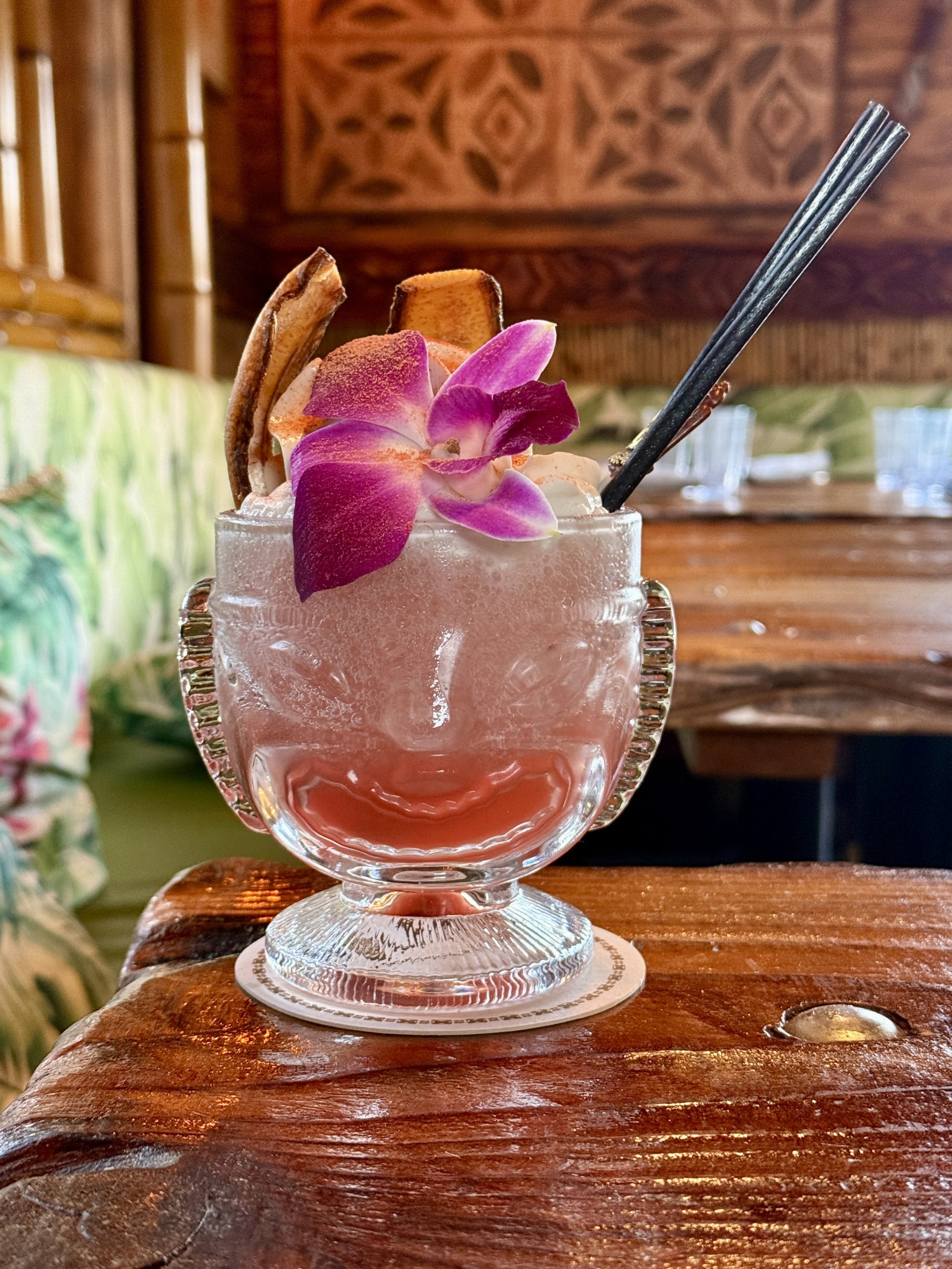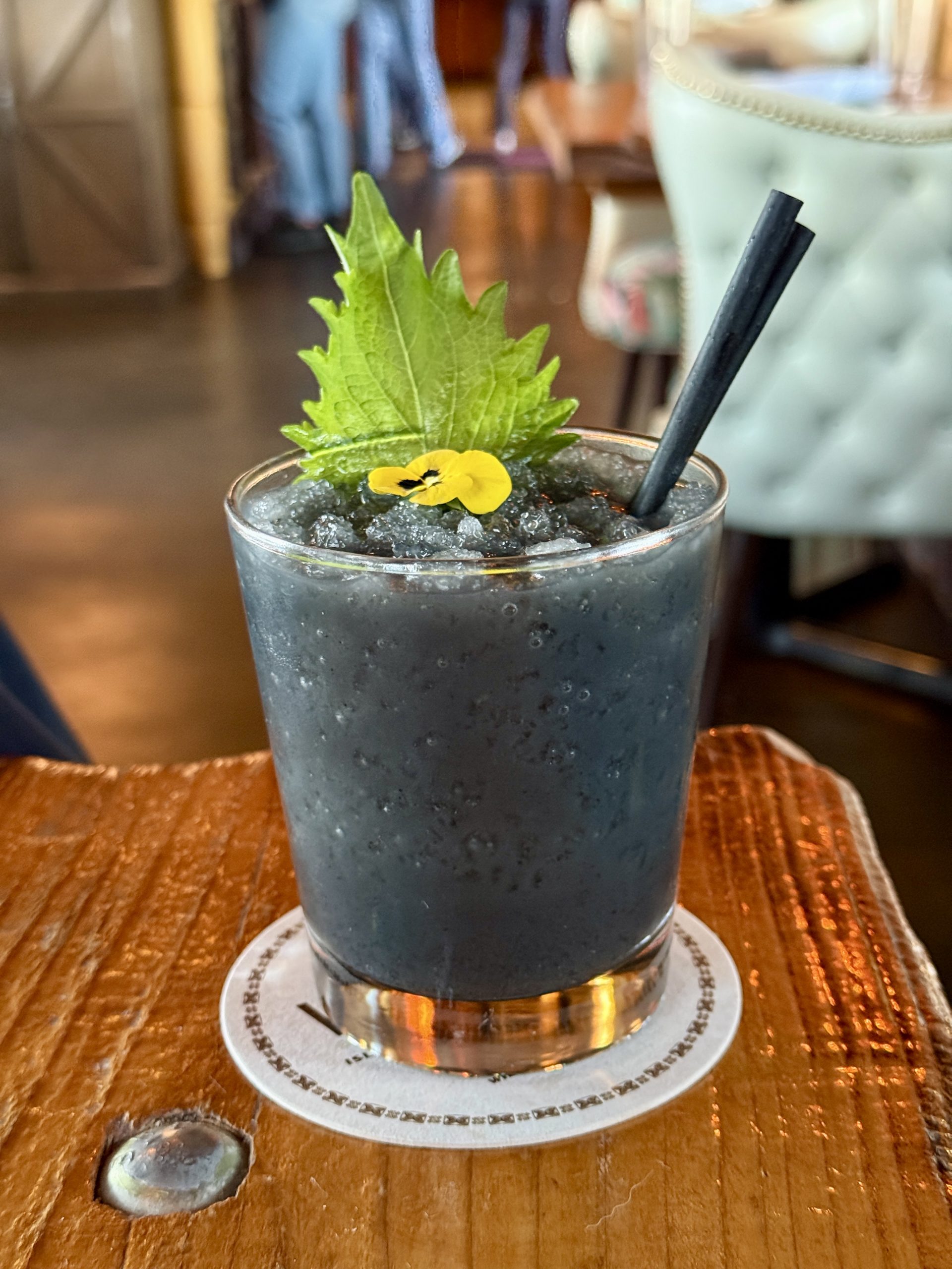 I perused the Mai Tai menu and decided to try something new by ordering the San Fransokyo. It’s quite a stretch to call this a “Mai Tai” considering it doesn’t have any original Mai Tai ingredients, but it has a type of orgeat so I suppose that’s fine. This black cocktail has some components I usually don’t have, including shochu, sake, cachaca, pisco, Cherry Heering, black sesame orgeat, shiso, and lemon. This is really sesame forward, and found it to be pretty enjoyable too. Maybe not in my regular rotation but definitely glad I tried it.
