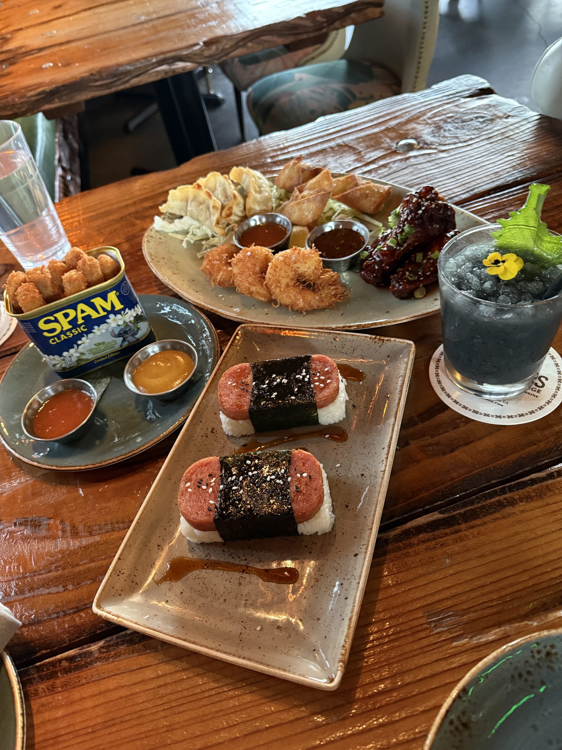 We always enjoy visits to Wilfred’s Lounge in downtown Napa, which is still doing a great job offering a Hawaiian-leaning food menu and a variety of exotic cocktails. This time we feasted on appetizers including a pretty nice Pupu Sampler Platter along with Spam fries and Spam musubi. The standout here were the Spam fries, perfectly fried and seasoned – and the salmon rangoon in the sampler platter had a nice spicy bite to them as well.
