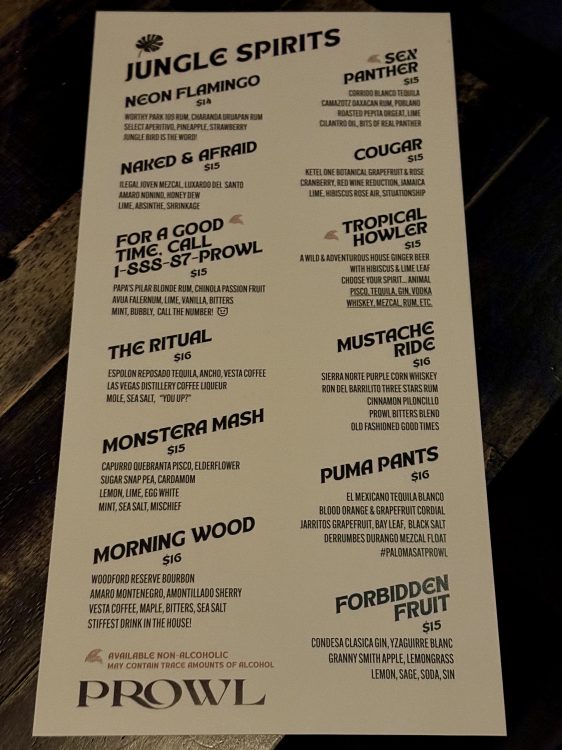 Prowl is a jungle themed lounge in Las Vegas’ arts district, next door to Stray Pirate and co-owned by the some of the same crew. We landed early evening on Friday to find a small mixed crowd and one bartender holding court. The thematic elements include some LED screens, plenty foliage, and a stone idol on one wall. There are a variety of seating areas and booths, plus some great looking lamps that’ll give you retro vibes.