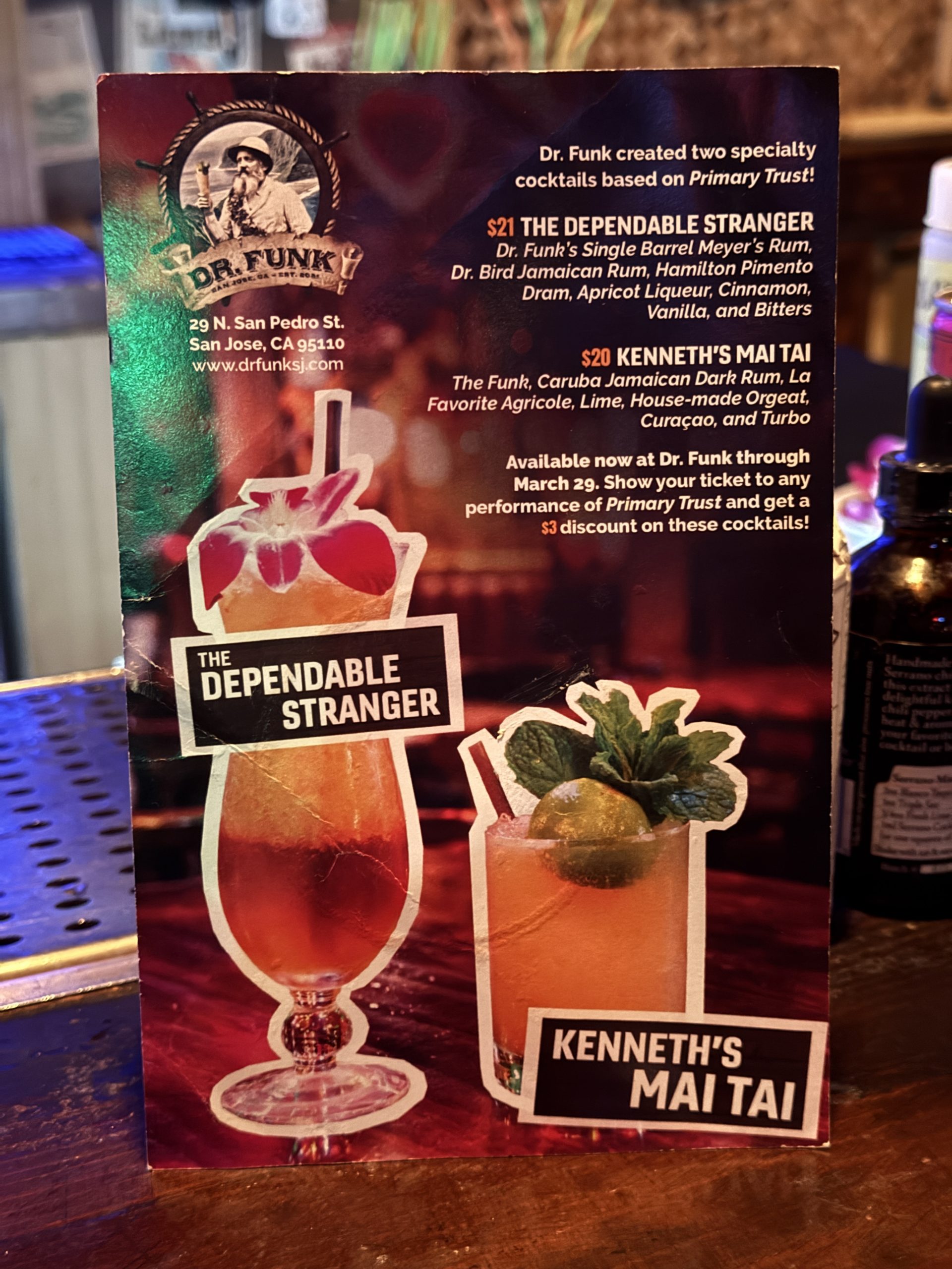 Dr. Funk has a special cocktail menu to celebrate the regional premiere of Pulitzer Prize-winning Primary Trust, showing at the Lucie Stern theater in Palo Alto through March 29. The special menu featuring two cocktails also runs through the 29th, with ticket holders getting a $3 discount.