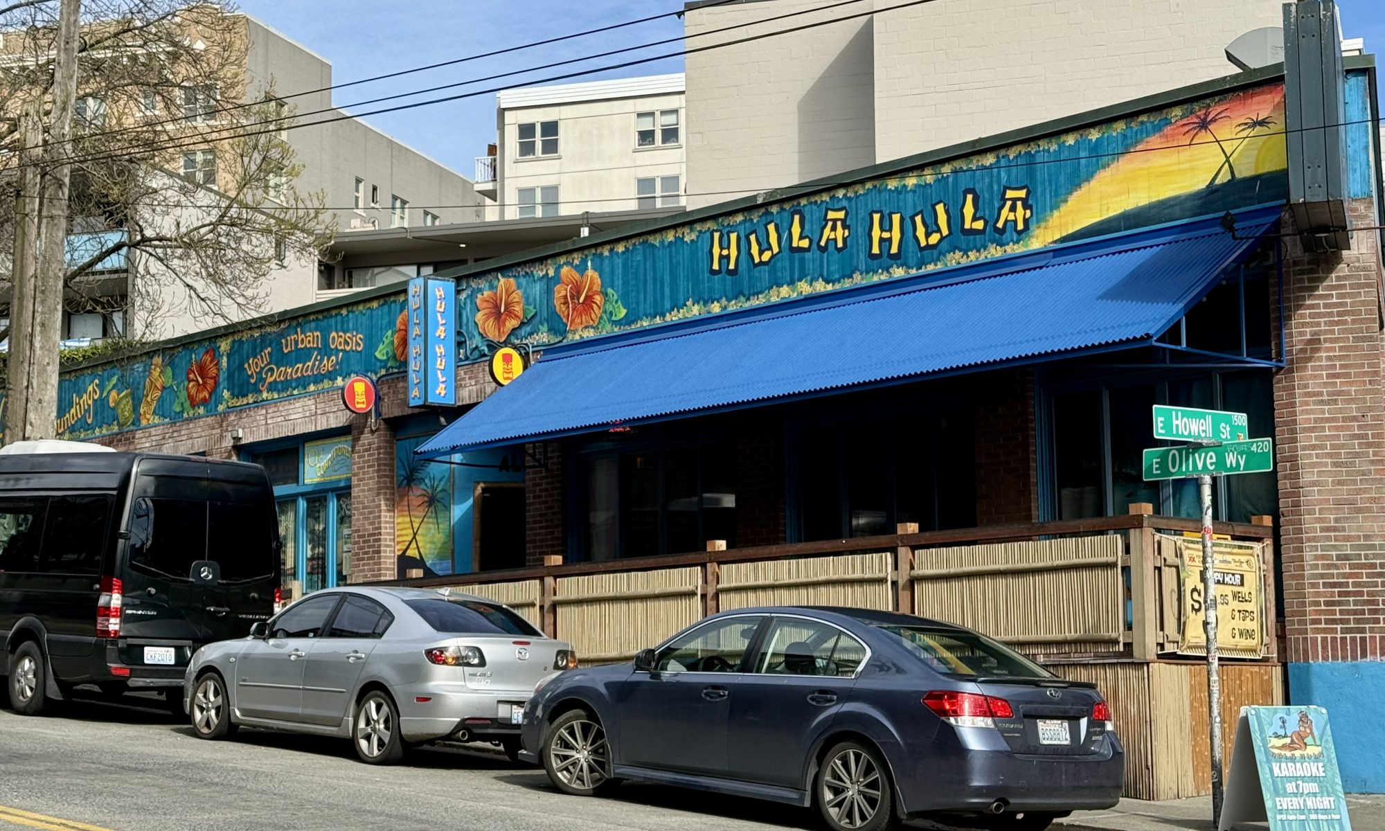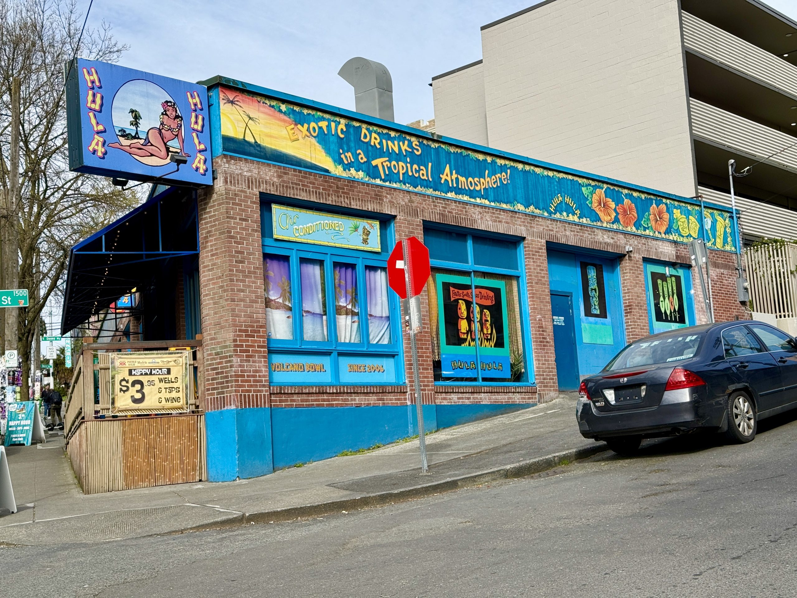 I’d been to Seattle many times but for various reasons never visited longtime tiki bar Hula Hula, in part due to its karaoke focus and rep for divey cocktails. But this trip I made a point to finally visit, walking up from my hotel to check it out at opening on a Friday.