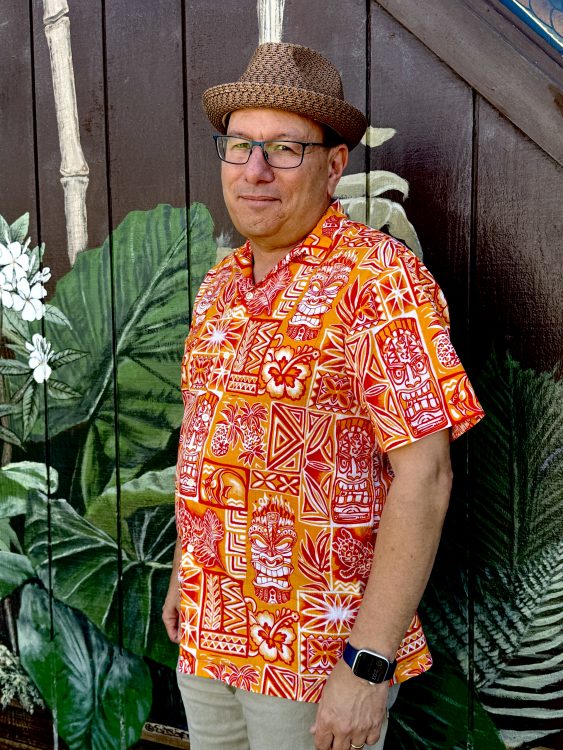 If you’re looking for something bright and orange to celebrate Hulaween this season, you might consider this Tiki Tropics Radiance shirt by Orrede. It’s 100% cotton with matching pockets and plackets, which I appreciate. That’s me at Forbidden Island yesterday and I’m pretty sure I was hard to miss in the crowd.