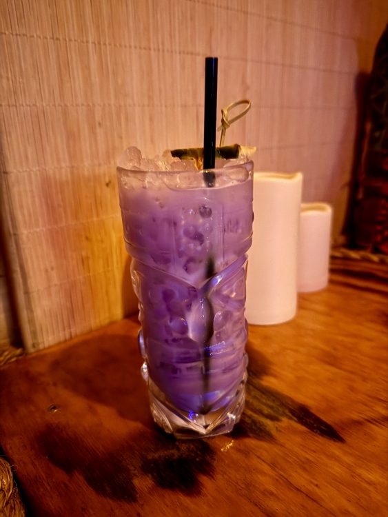 The Twisted Tiki is inside the McFadden Public Market, right off the main entrance on Main Street. The moai is your hint there’s something behind the door, and we were able to get a table basically right away inside the Bamboo Room where the bar is located. The Shipwreck room is across the Foyer and is used as an overflow space. Both rooms are small but nicely appointed with no windows to keep things dark and cozy, and for a food hall the decor is pretty reasonable – this certainly isn’t a million dollar build but for this type of venue we’ve seen far worse.