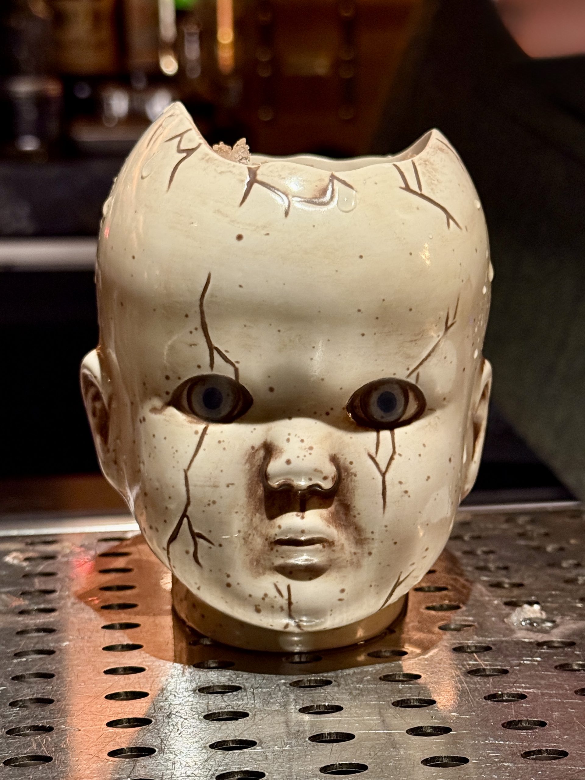 I started with The Dark, an absolutely delightful coffee cocktail with an orange foam and a chocolate pentagram garnish. Meanwhile, Mrs. Mai Tai had the Isle de las Muñecas with tequila, carrot, and ginger – served in a disturbing baby doll’s head mug. This was a really great cocktail and the vegetal notes were interesting and well-balanced.