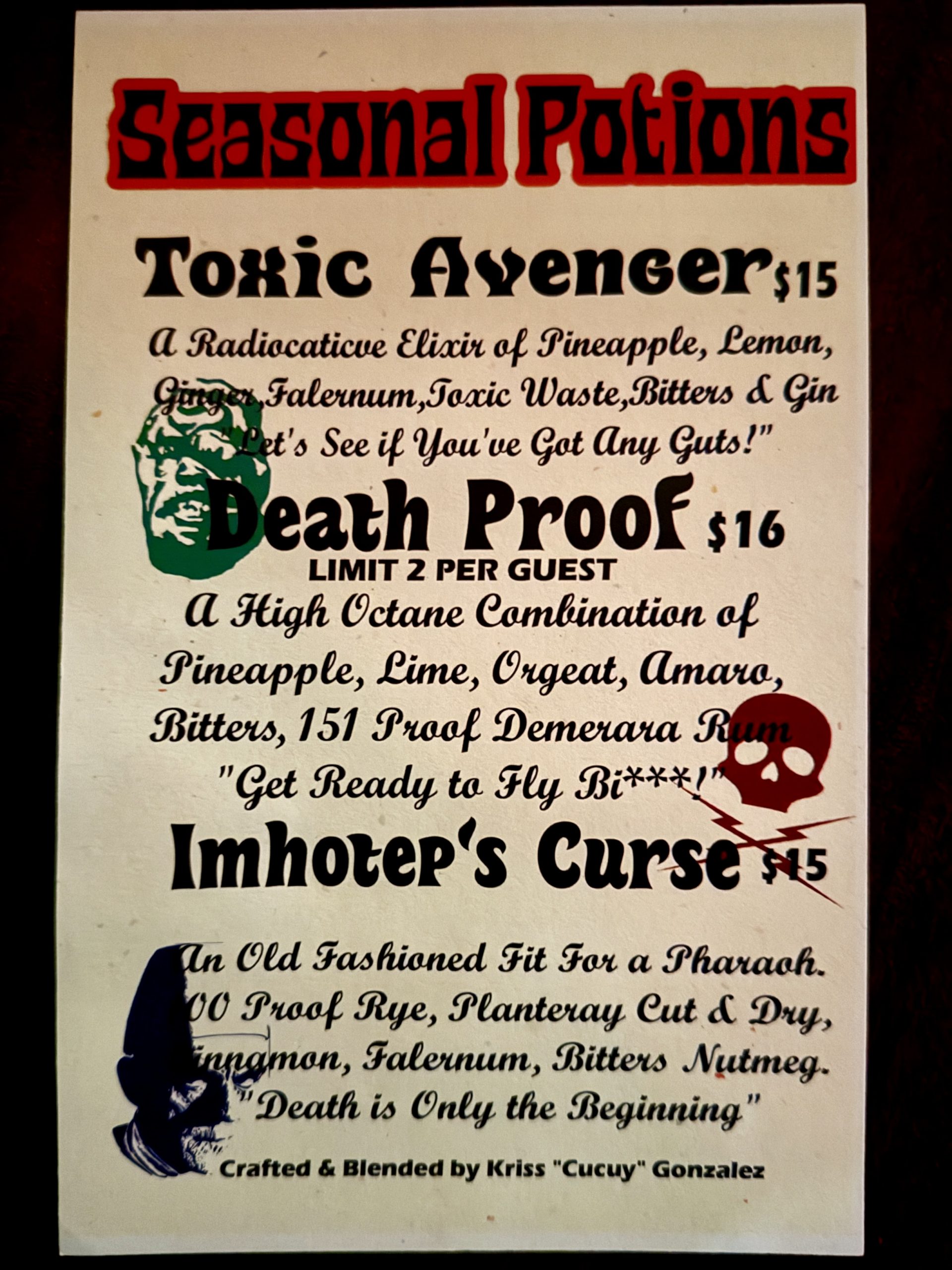 Those were the only cocktails we tried on this visit, though was interested in the special Halloween menu from Kriss “Cucuy” Gonzalez that’s also movie inspired. Check it out while you can.