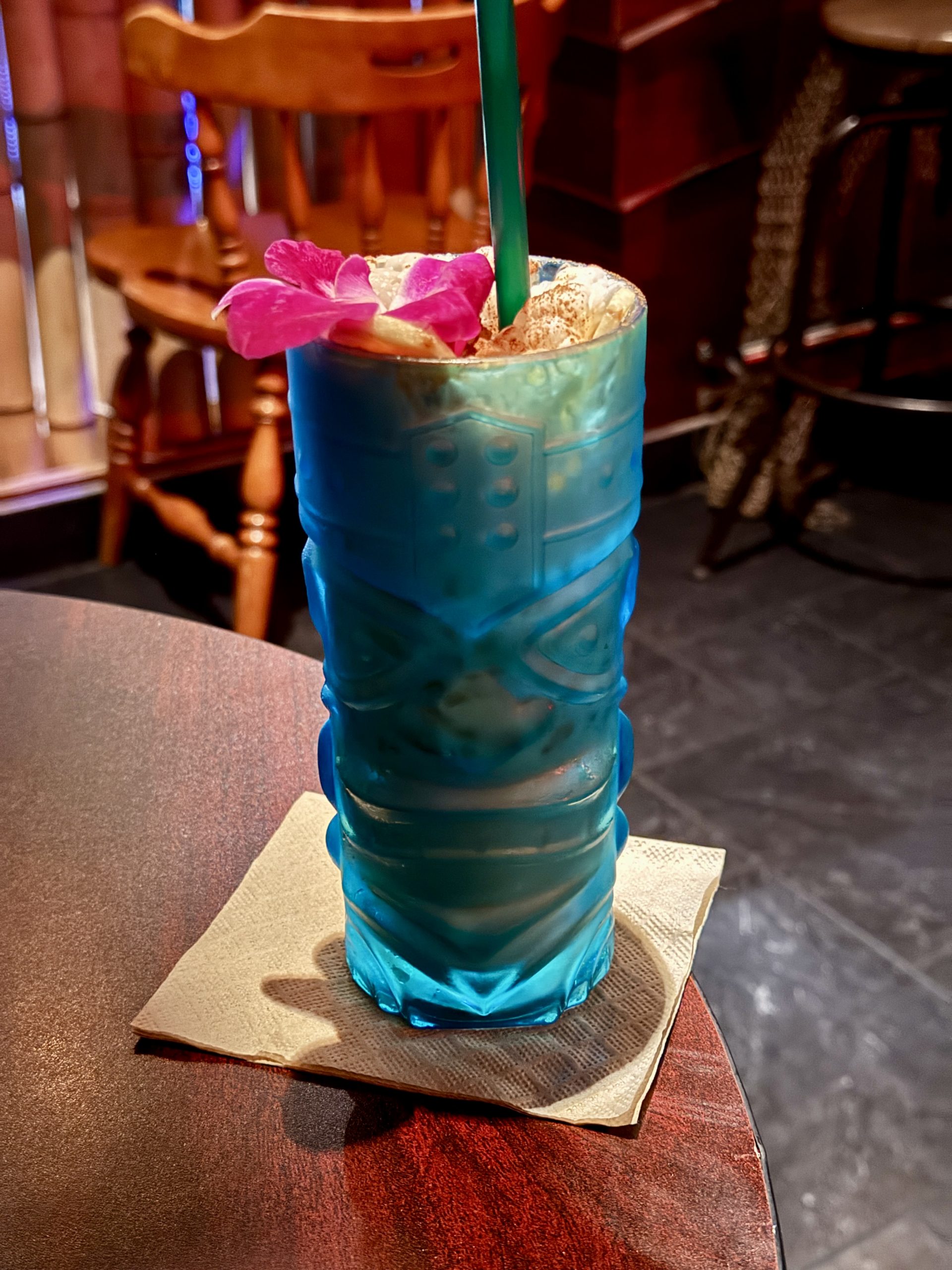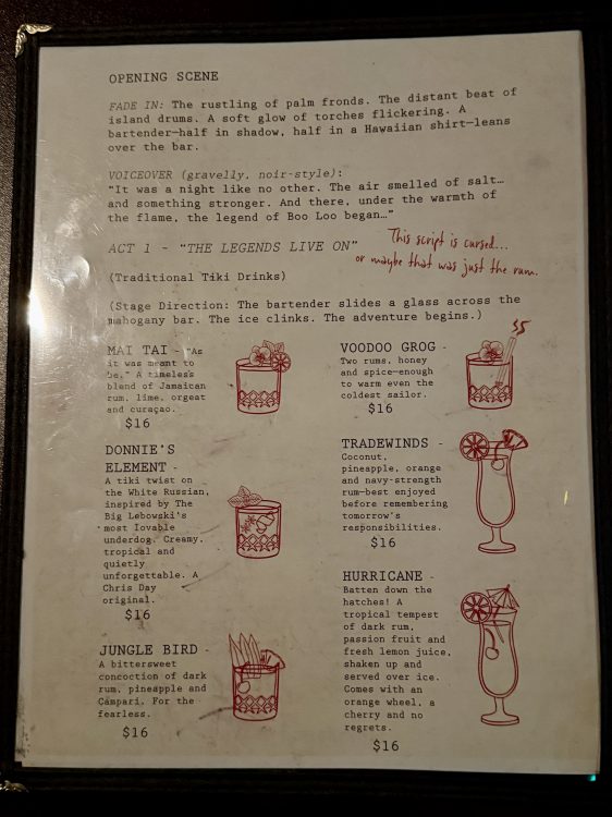 The menu format takes inspiration from Boo Loo’s location in the Orinda Theater complex, laying it out like a screenplay with red editorial notes in the margins. It’s a clever way to draw in many of the patrons who are new to tiki and visiting due to the proximity of the theater or the local restaurants and shops. There are 14 cocktails plus three NA options, plus beer and wine, and is a nice mix of classics along with a few originals and some good options for tequila, gin, and whiskey drinkers.