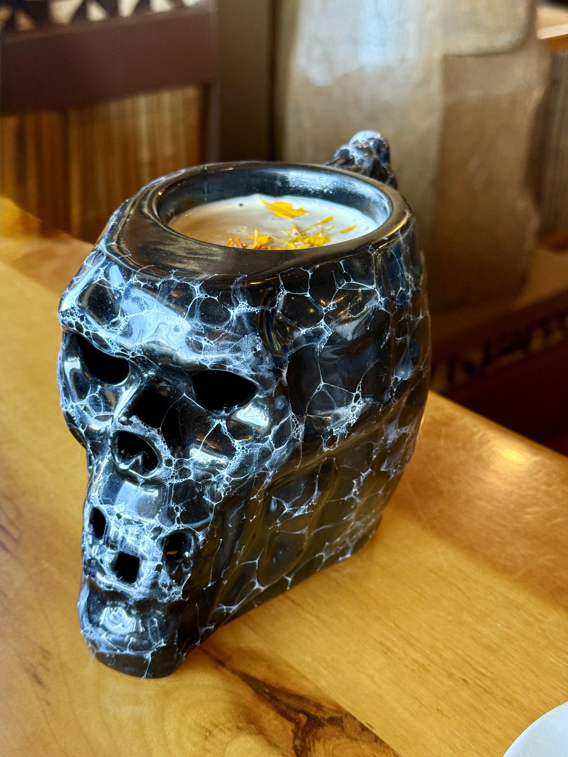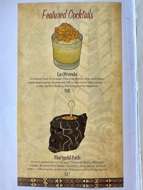 There were a couple fall cocktails on the menu, which we tried with mixed results. I tried the La Ofrenda which featured Mexican rum, pepita syrup, and Limpia’auras Herbal Liqueur. I wanted to embrace some new flavors but this blend didn’t do it for either of us. Much better was Mrs. Mai Tai’s Marigold Path, also featuring Mexican rum plus Hot Buttered Rum Batter and a host of spices. Served hot, Marigold Path was a delightful cocktail with a ton of flavor to savor.