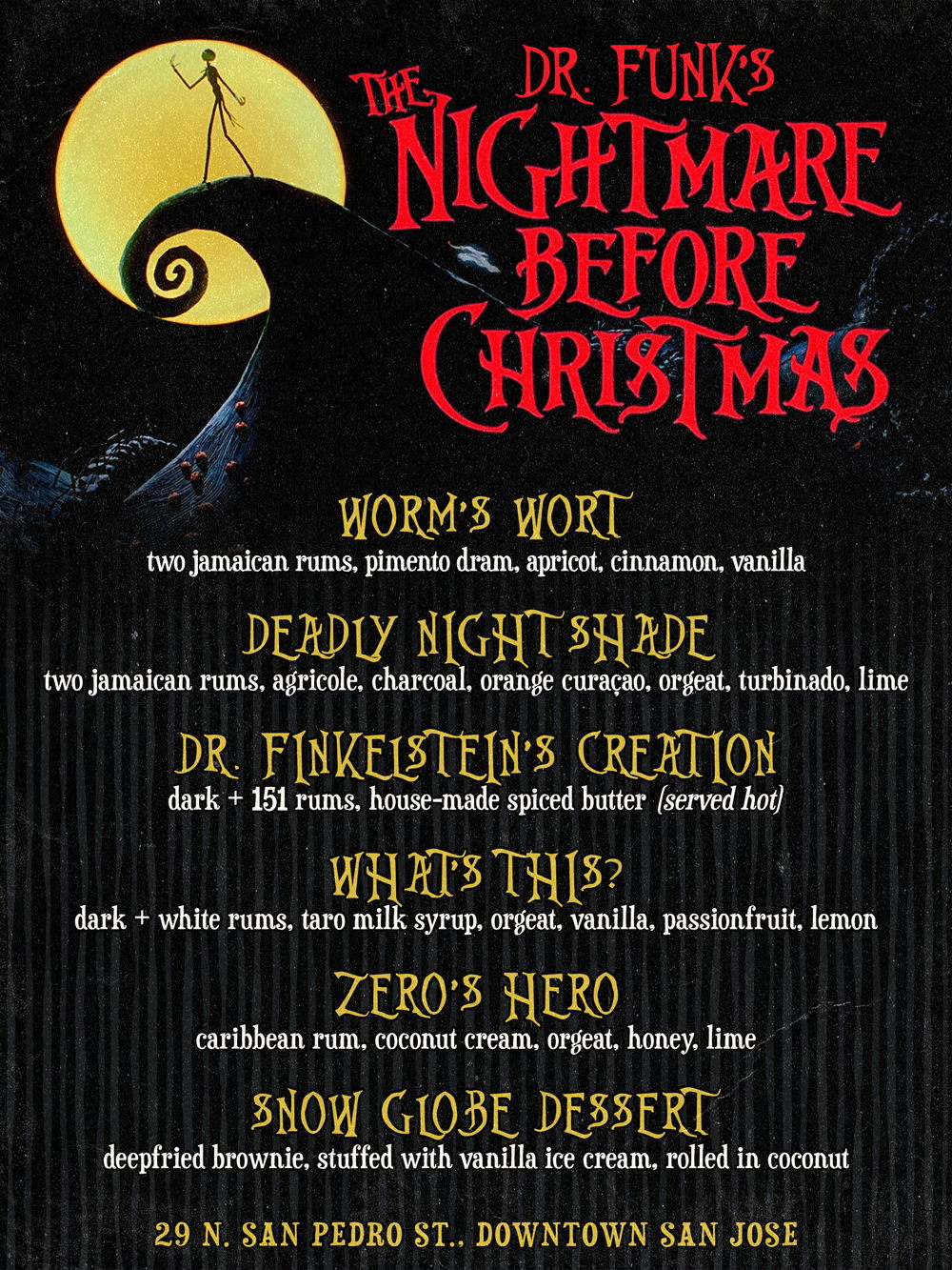 Downtown San Jose’s cocktail scene is really hitting its stride, and there are tons of holiday offerings so Dr. Funk is doing another holiday pop-up to blend their tiki bar with a themed overlay. This year’s theme is Tim Burton’s Nightmare Before Christmas, including some fab decor and special menu items.
