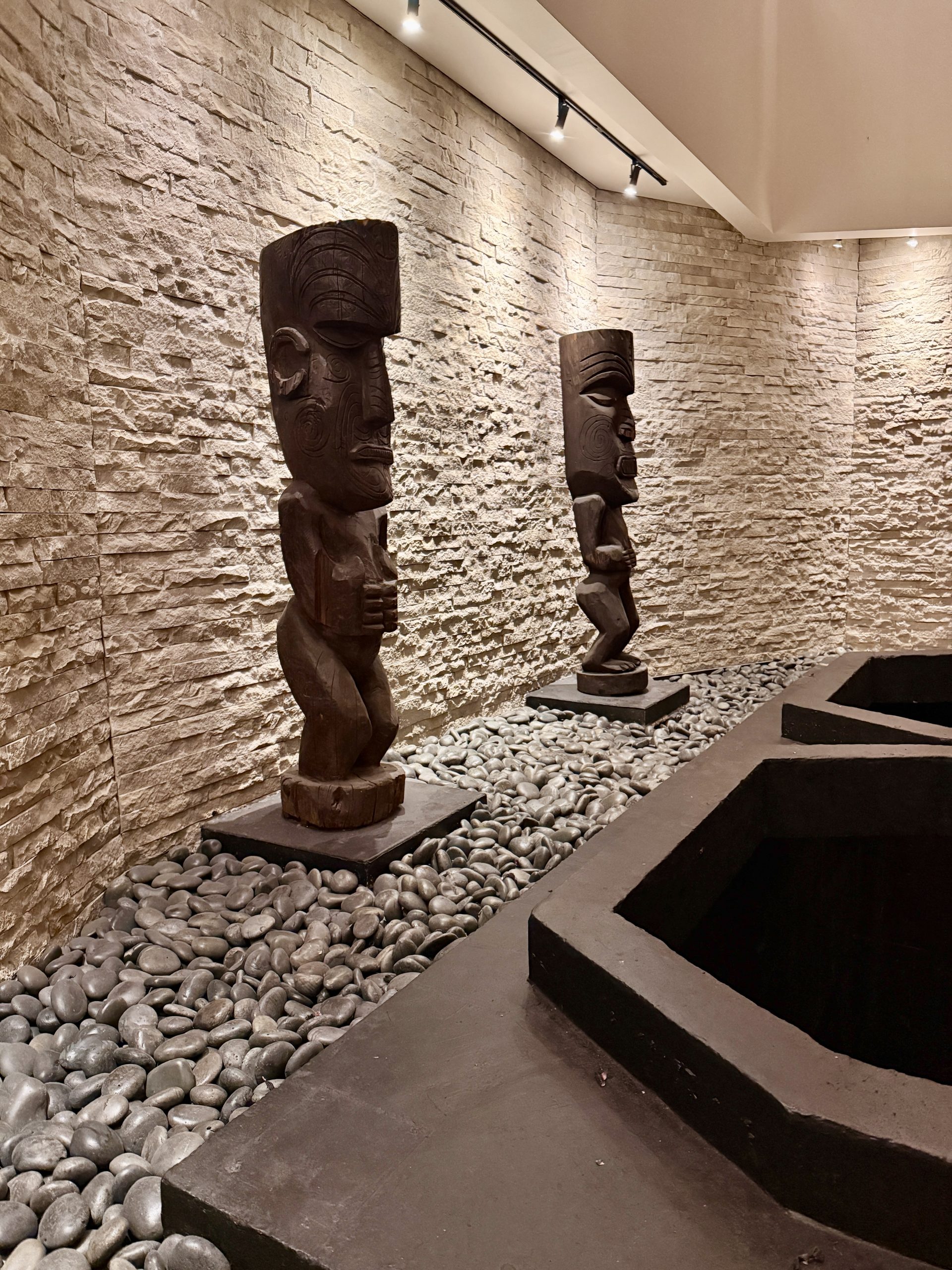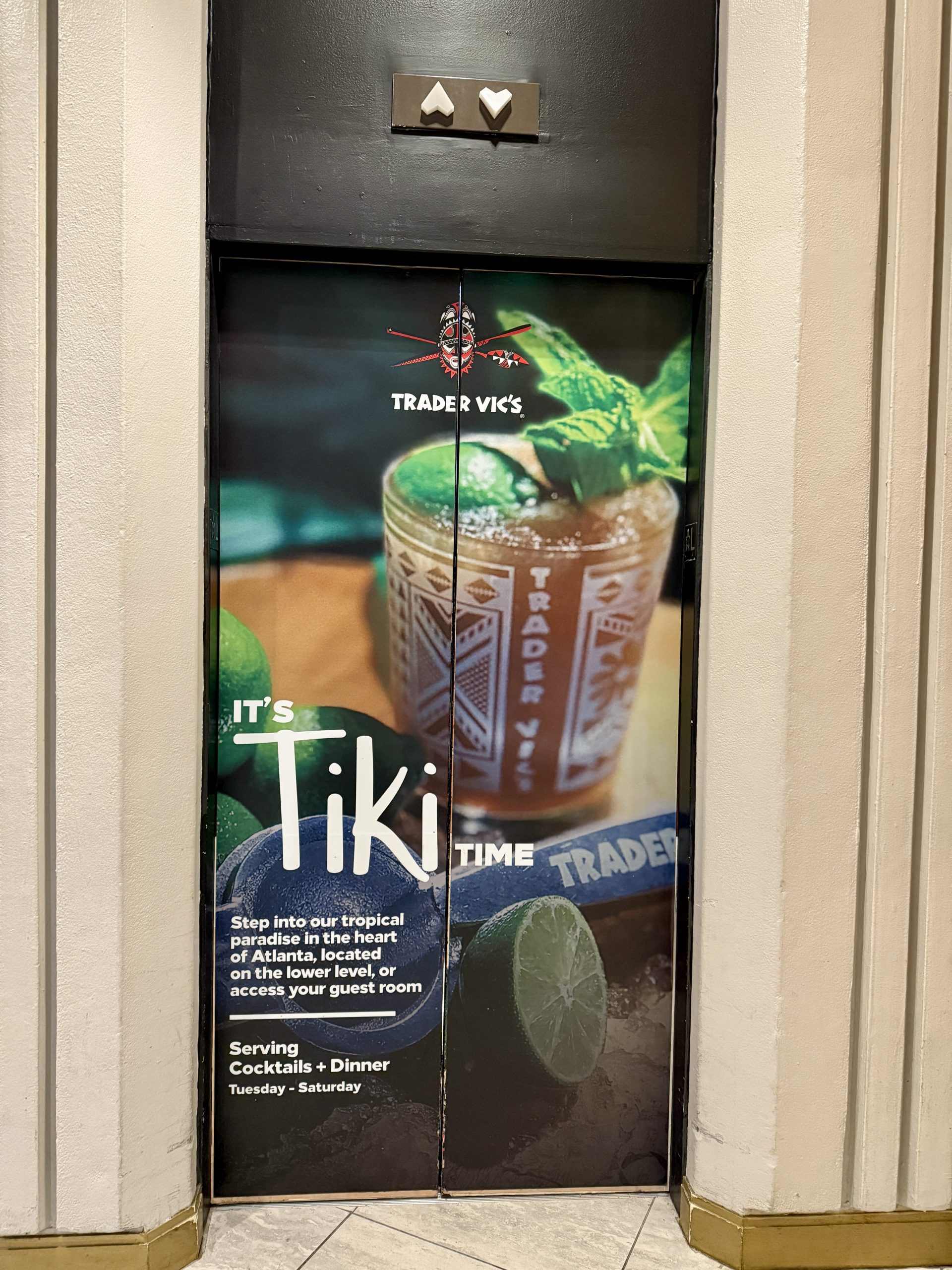 A highlight of our Inuhele weekend was a visit to the last restaurant that opened during Trader Vic’s lifetime. Located in the basement of the Hilton hotel, Trader Vic’s Atlanta will be celebrating its 50th anniversary later this year and significant portions of the venue haven’t been touched since opening. The eye candy starts before you enter with large Barney West tikis behind the elevators, plus a large foyer that leads to the Mai Tai Bar and then to three distinct dining areas.