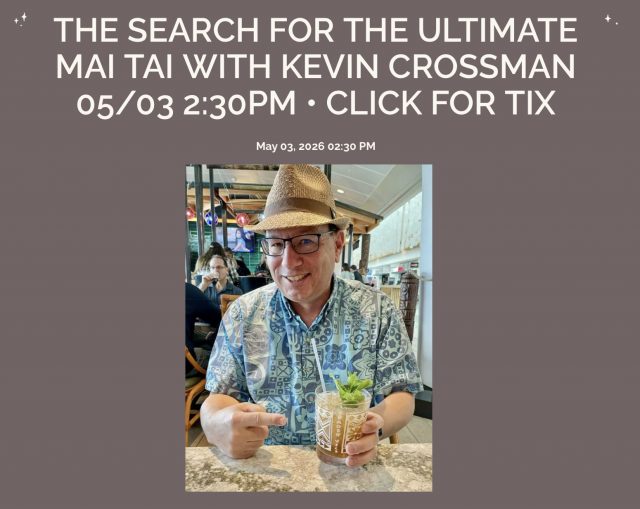 You can look forward to an informative and humorous presentation describing the hunt for the ultimate Mai Tai. You’ll enjoy delicious variations on this classic cocktail while discovering newly uncovered historical details, best and worst Mai Tais, and how to get the perfect Mai Tai at your local watering hole. Advice and lessons for the home bartender will be provided, plus plenty of eye candy and Q&A.