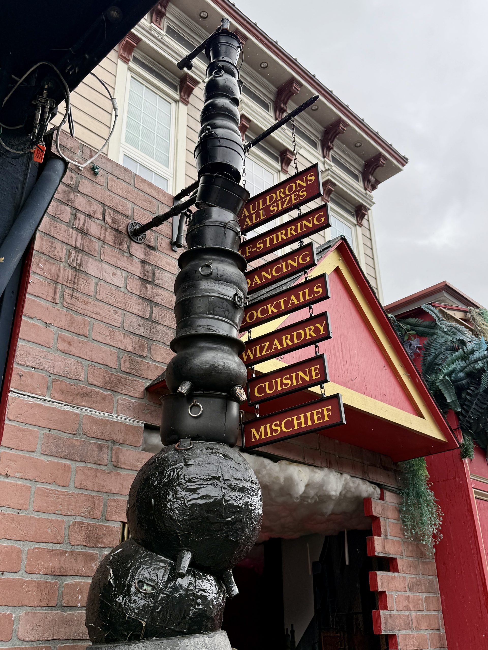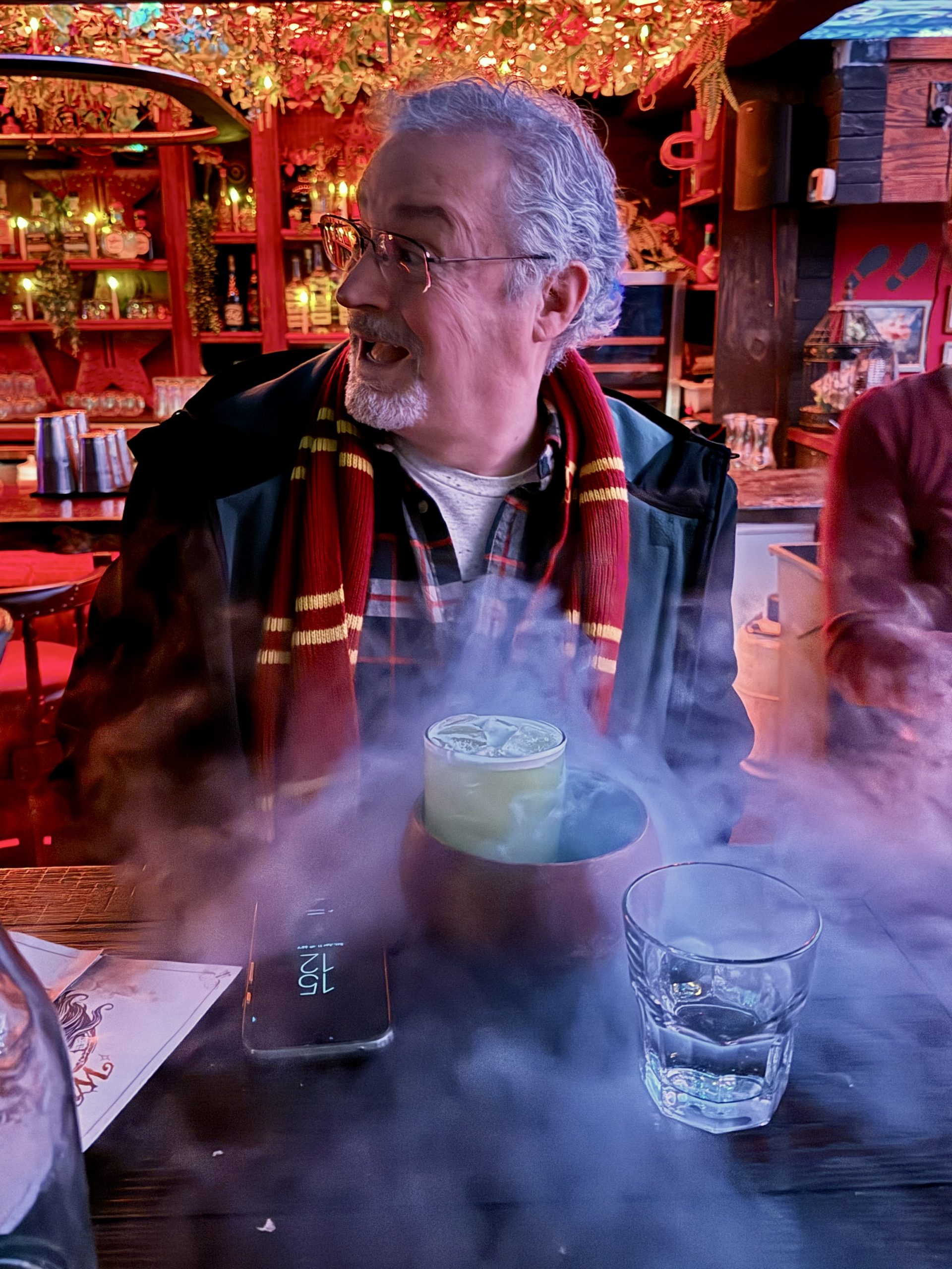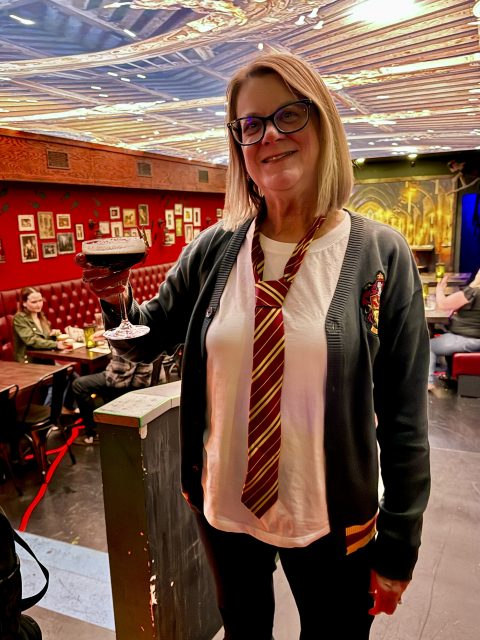 The entry area features some thematic elements and occasional light shows. There’s a nice dark tavern vibe in this area which is where our party of six was seated. There are a few themed cocktails including riffs on standards plus beer choices. I quite enjoyed the Love Potion with tequila/hibiscus and the Butterbeer flavored Wizard Brew was also very good. Some of the drinks come with special features, such as the smoke with Glen’s or the note that’s set on fire with Julie’s Espresso Elixir, though they don’t lean heavily on the drink gimmicks here.