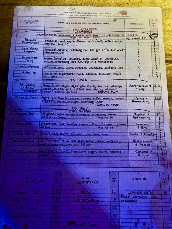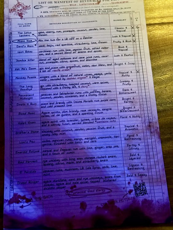 There was good energy at Last Rites even as some of the crowd dispersed during our excursion. The great looking menu has been revised since our last visit and it’s somewhat easier to read than past editions. The manifest style design with blood stains really conveys the downed aircraft theme that Last Rites is famous for.