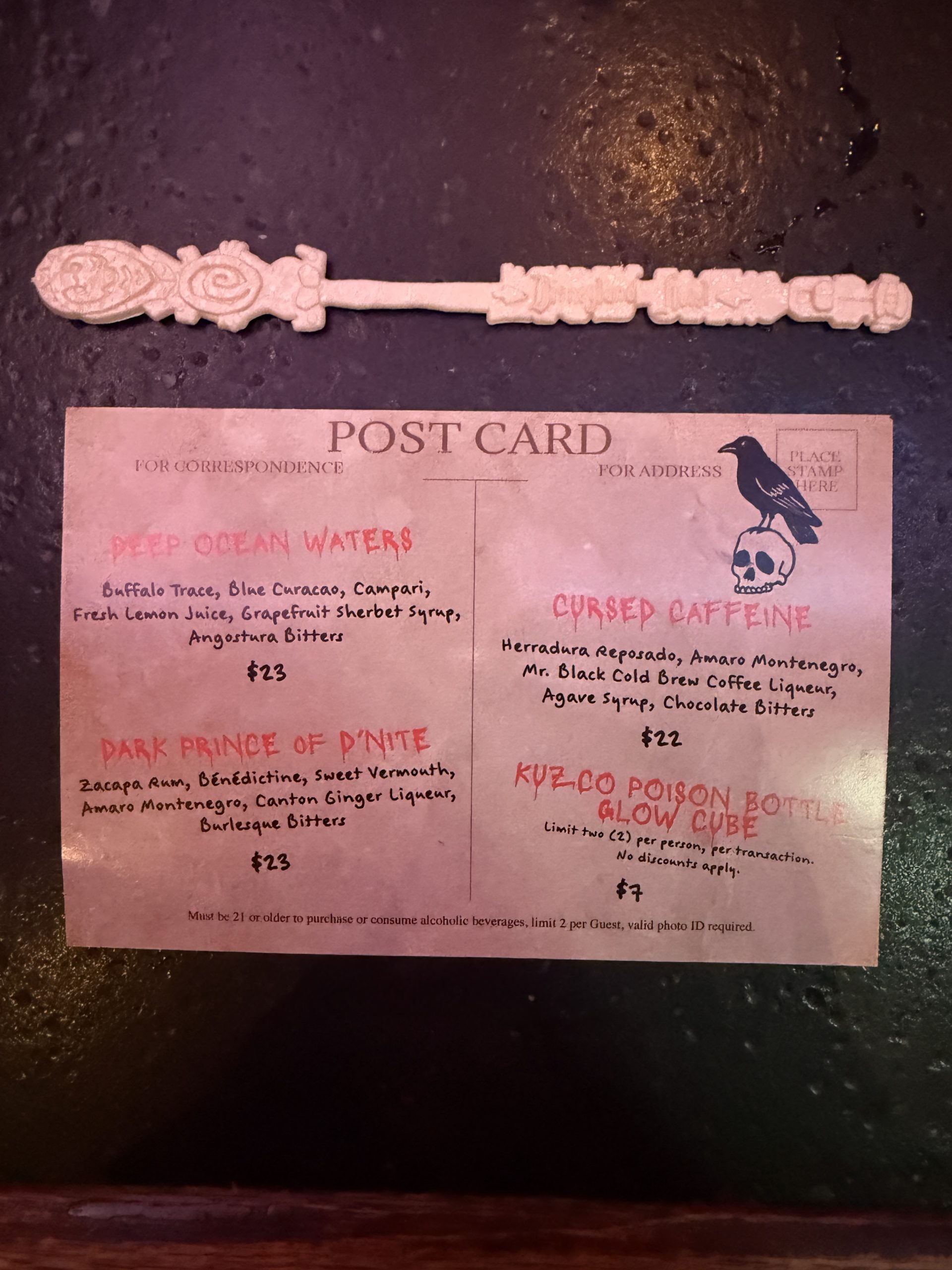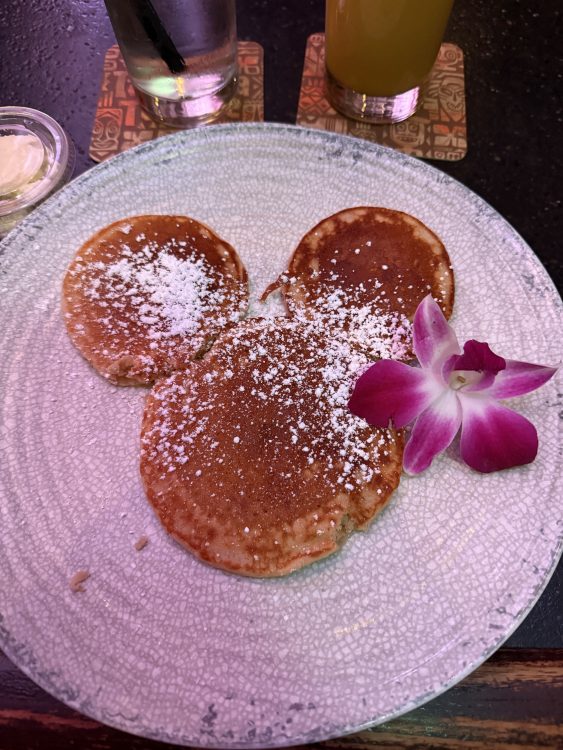 The small-ish menu is fairly standard with a few Polynesian twists on breakfast favorites. I went with some eggs with ham and potatoes, while Mrs. Mai Tai enjoyed a fluffy Mickey Mouse shaped pancake. She wasn’t drinking and had a glass of orange juice that was actually far larger than those little glasses of OJ you usually see at breakfast. There are a couple Halloween cocktails on a special menu but we didn’t try any.