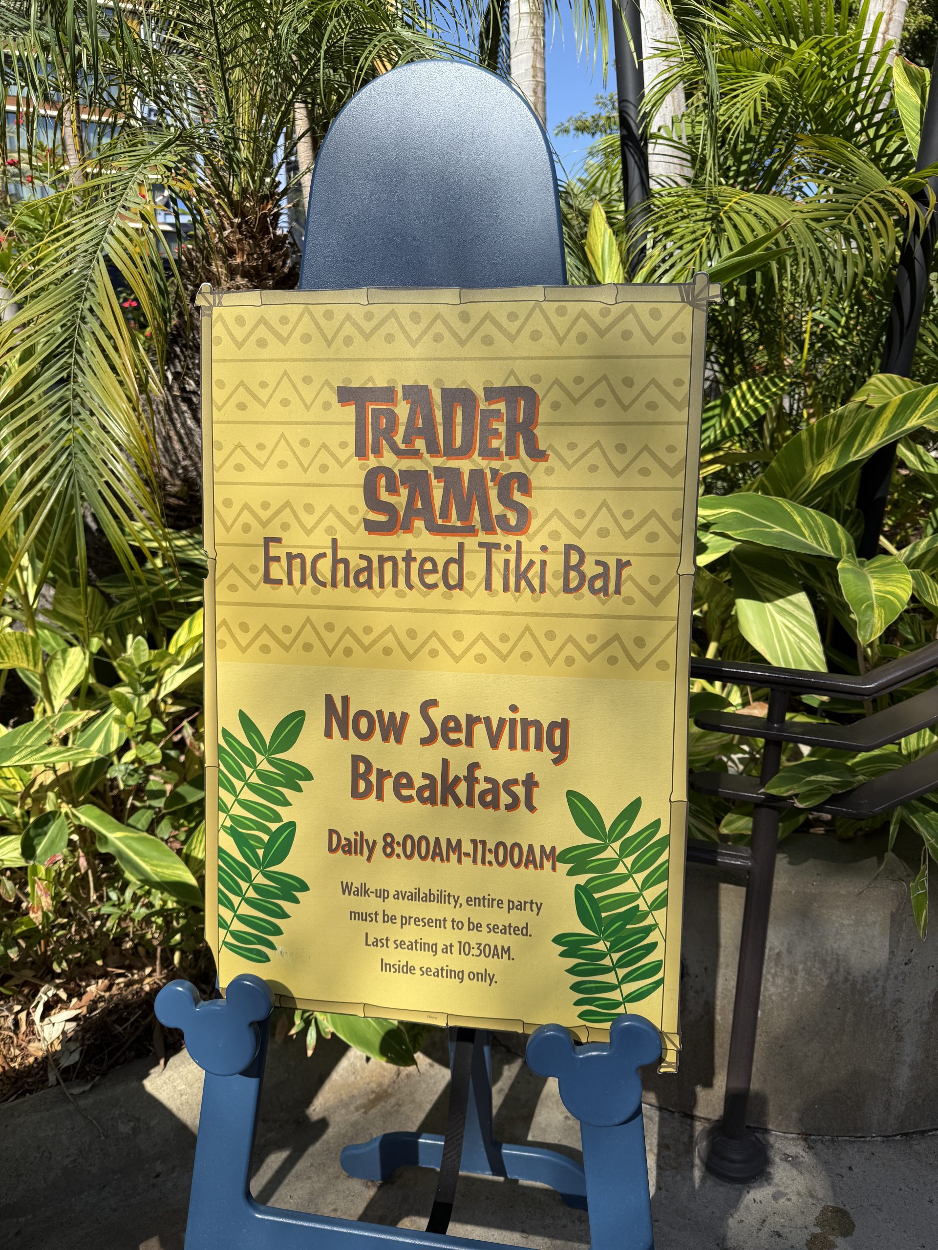 We always enjoy visiting Trader Sam’s Enchanted Tiki Bar at the Disneyland Hotel and wanted to check out the breakfast service that’s been running for a few months. Parking at the Disneyland Hotel is easy and you can get valet parking validated at Sam’s for 3 hours, so there’s no cost other than the tip to the valet runner. Breakfast runs from 8:00 am to 11:00 am, then Sam’s transitions to their everyday lunch/dinner menu.