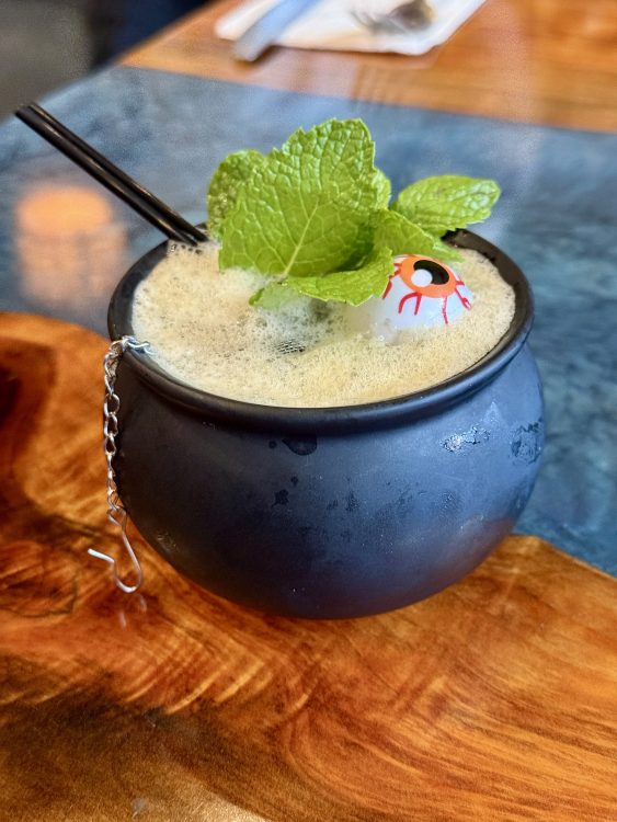 While attending brunch we saw that Hula Hoops has a couple seasonal offerings and the Witches Brew was recommended. The ingredients are black rum, citrus, and charcoal syrup meaning this leans tart but overall pleasant. It’s served in a little cauldron and contains a little dry ice inside a metal tea bag, so it bubbles ever so subtly as you drink it!