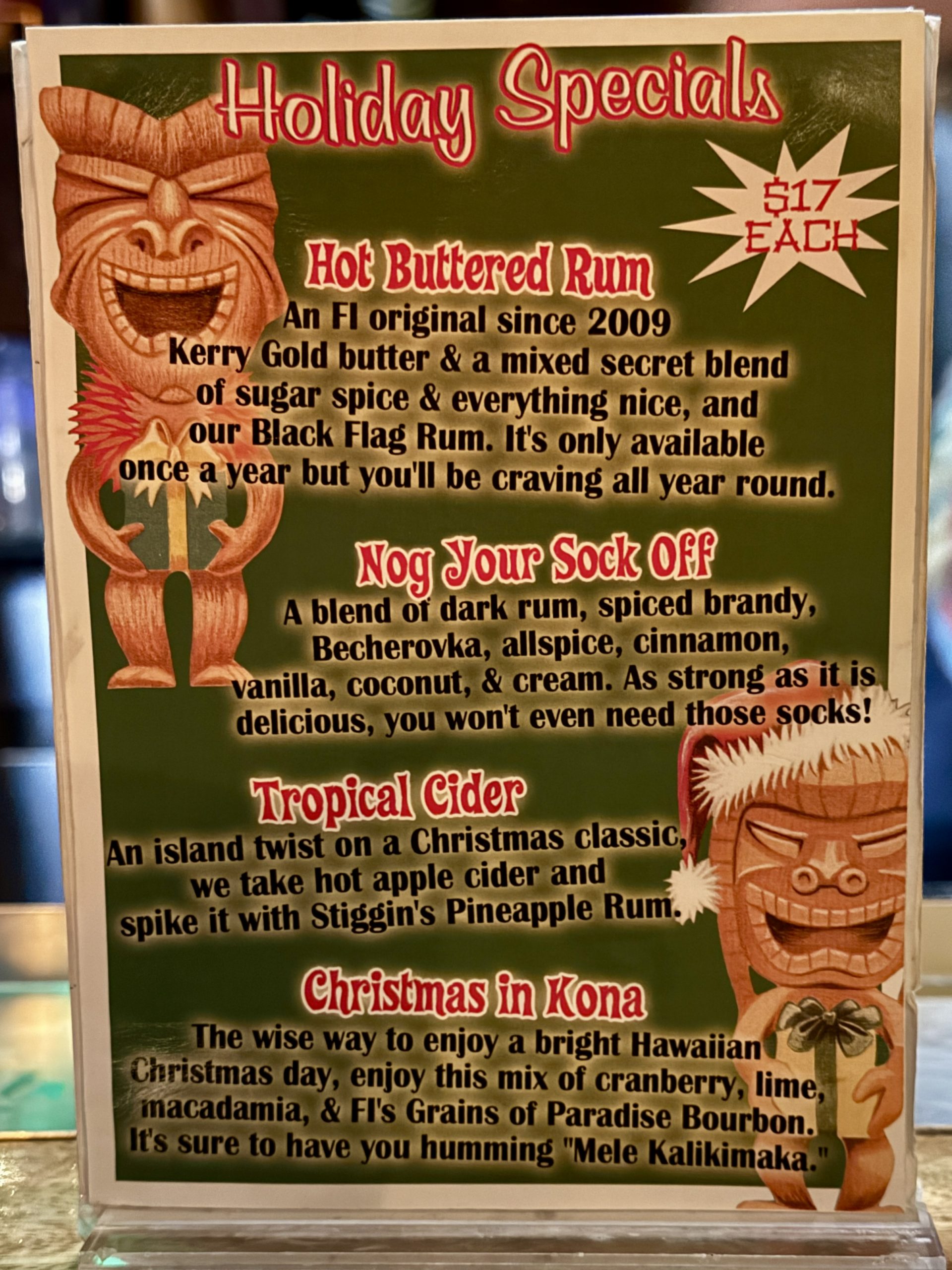 While I drank some rums from FI’s Kill Devil Club list, Mrs Mai Tai had a couple drinks from the holiday cocktail menu. I thought the Tropical Cider was really great and I loved the herbal elements in the Nog Your Socks Off. The Hot Buttered Rum is always good here too, so check these out while you can.